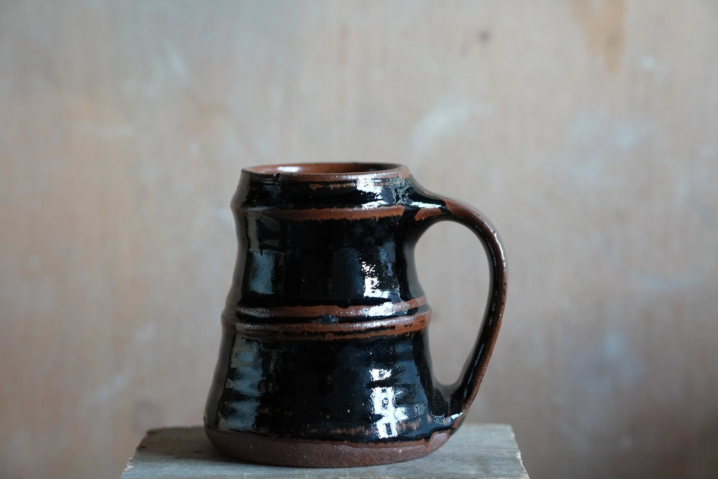 Following initial melt tests I formulated a dark stoneware body using the red clay, and a number of glaze recipes based around the yellow. These ranged from as much 3:1 clay/ash (mug, pictured adjacent) to recipes where the yellow clay and shale served as an addition in lower percentages.